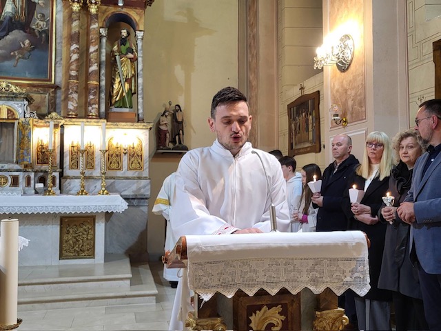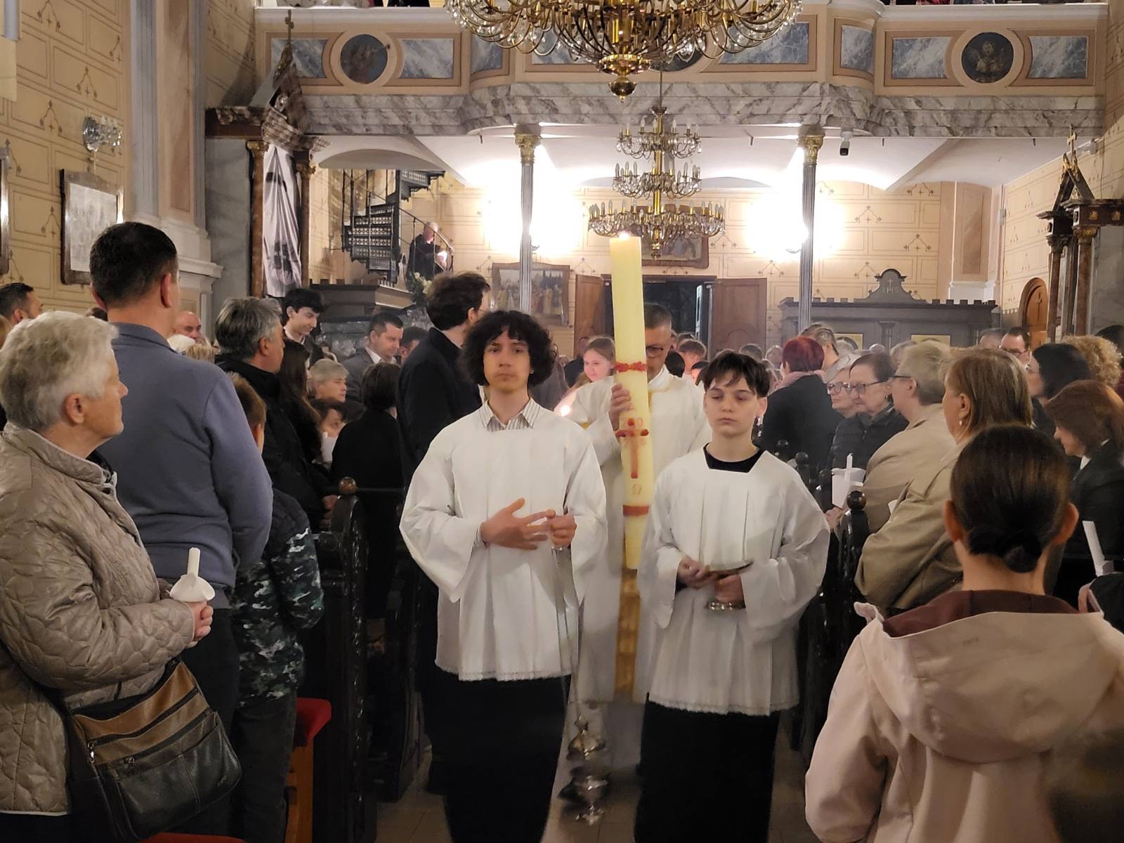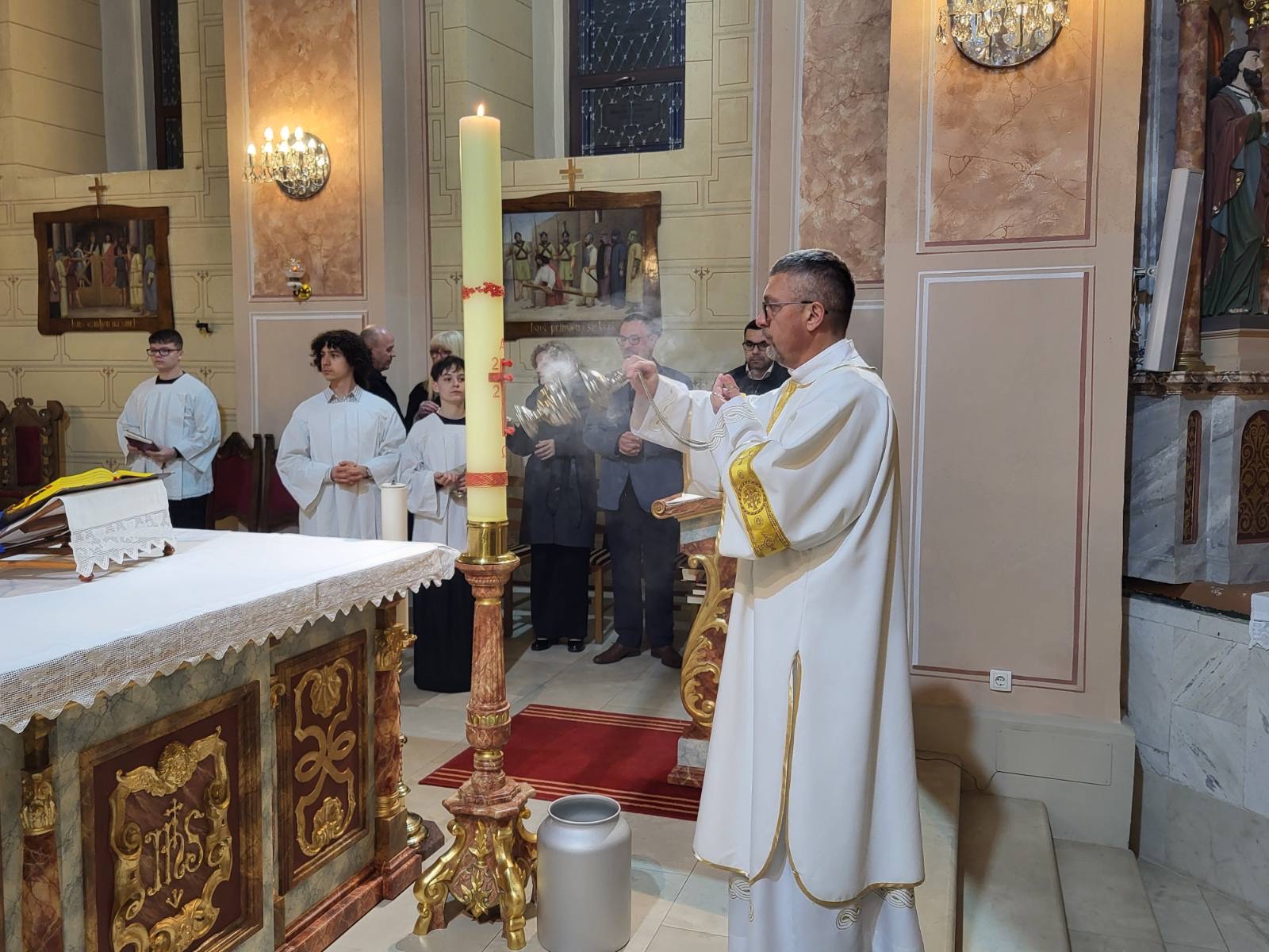Ujutro od 8:30 h bilo je izloženo Presveto iznad Isusova groba na poklonstvo. Kroz čitav dan vjerni puk pohodio je Isusov grob i zahvaljivao Gospodinu na njegovoj žrtvi za nas i naše otkupljenje. Zajedničkim klanjanjem u 19:30 h koje je predvodio đakon Miljenko, završili smo pohod grobu i započeli Vazmeno bdijenje blagoslovom ognja ispred crkve u 20 h. Obrede Velike subote predvodio je župnik Tomislav uz asistenciju đakona Miljenka te uz prisustvo vjernog puka koji je došao proslaviti Isusovo uskrsnuće. Hvalospjev uskrsnoj svijeći pjevao je Ivan Golubić, kandidat za trajni đakonat. Misna čitanja čitali su naši vrijedni liturgijski čitaći, a pjevanje animirali, u zajedništvu, članovi svih naših zborova.